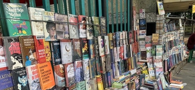 Targetlink.id– Susunan deretan buku di papan plang dengan berbagai tulisan di Jalan HB Alhabsyi Kwitang persimpangan seberang Pasar Senen, Jakarta Pusat.