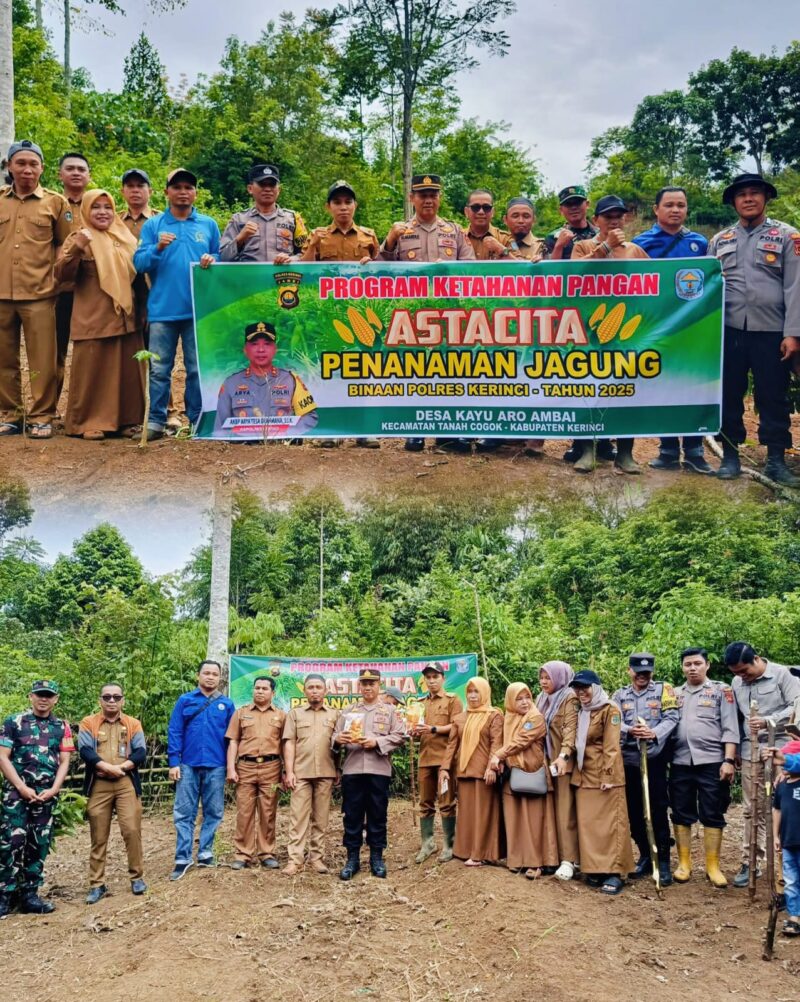Kerinci, TargetLink.id – Kepala Desa Kayu Aro Ambai, Aan Prananda, memberikan apresiasi kepada Polres Kerinci, Polsek Sitinjau Laut, Koramil 04 Sitinjau Laut, serta Pemerintah Kecamatan Tanah Cogok yang telah menggandeng masyarakat dalam program ketahanan pangan melalui penanaman jagung, Senin (29/9/2025).