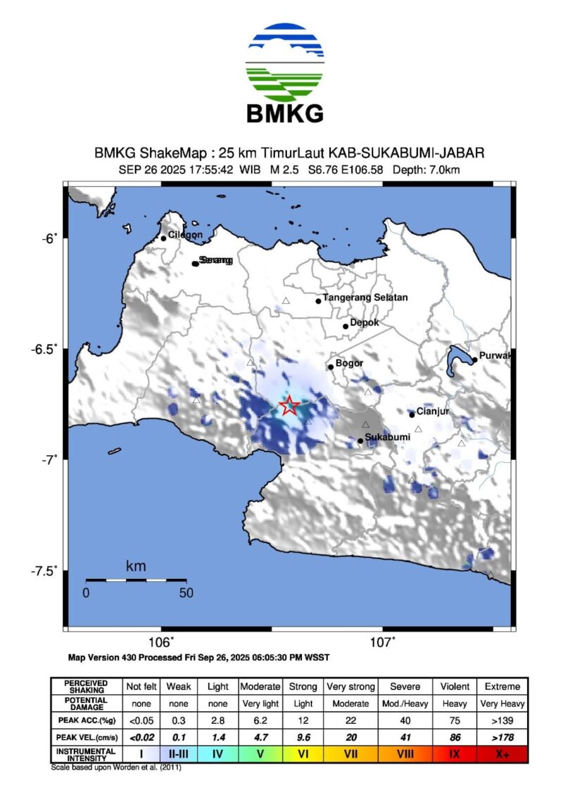 TargetLink.id – Wilayah Kabupaten Sukabumi, Jawa Barat, di guncang gempa tektonik pada Jumat (26/9/2025) pukul 17.55 WIB. Badan Meteorologi Klimatologi dan Geofisika (BMKG) mencatat gempa tersebut memiliki magnitudo 2,5. “Hasil analisa BMKG menunjukkan bahwa gempa bumi ini berkekuatan M2,5,” kata Kepala Stasiun Bandung, Teguh Rahayu, melalui keterangannya.