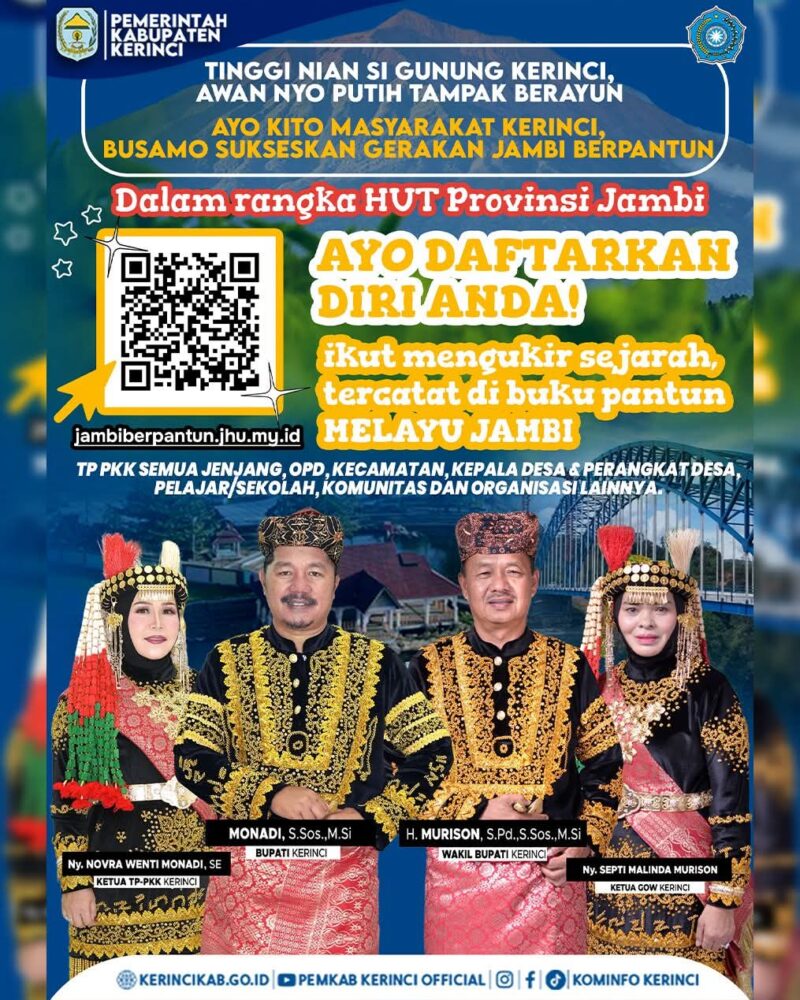 “Kami mengajak semua pihak untuk bersama-sama menjaga budaya lokal. Pantun bukan sekadar sastra, tapi juga bagian dari jati diri masyarakat Jambi,” ujar pihak pemerintah Kabupaten Kerinci.