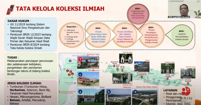 “Adapun jenis koleksi ilmiah yang saat ini telah dikelola oleh DPKI BRIN yaitu koleksi ilmiah tumbuhan, terdiri dari tumbuhan hidup, herbarium, xilarium, bank biji, tanaman hasil pemulihan. Kemudian koleksi ilmiah berupa hewan, mikroorganisme, biobank, batuan, artefak, manuskrip, dan Bahasa”tutupnya