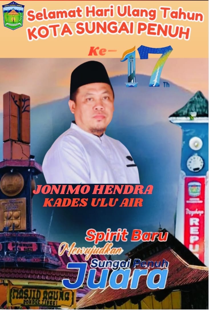 Sungai Penuh, Targetlink.id – Kepala Desa Ulu Air, Jonimo Hendra, menyampaikan ucapan selamat atas Hari Ulang Tahun (HUT) ke-17 Kota Sungai Penuh yang di peringati pada 8 November 2025.