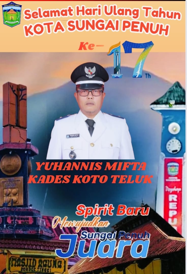 Sungai Penuh, Targetlink.id – Kepala Desa Koto Teluk, Kecamatan Hamparan Rawang, Yuhannis Mifta, menyampaikan ucapan selamat atas HUT ke-17 Kota Sungai Penuh.