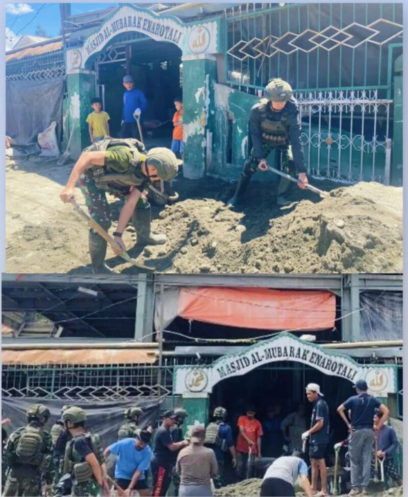Para prajurit bekerja sama dengan warga. Mereka mengangkat material, merakit rangka konstruksi, dan membersihkan area masjid. Suasana kebersamaan sangat terasa. Semangat gotong royong mencerminkan nilai karya bakti dalam kehidupan sosial masyarakat.