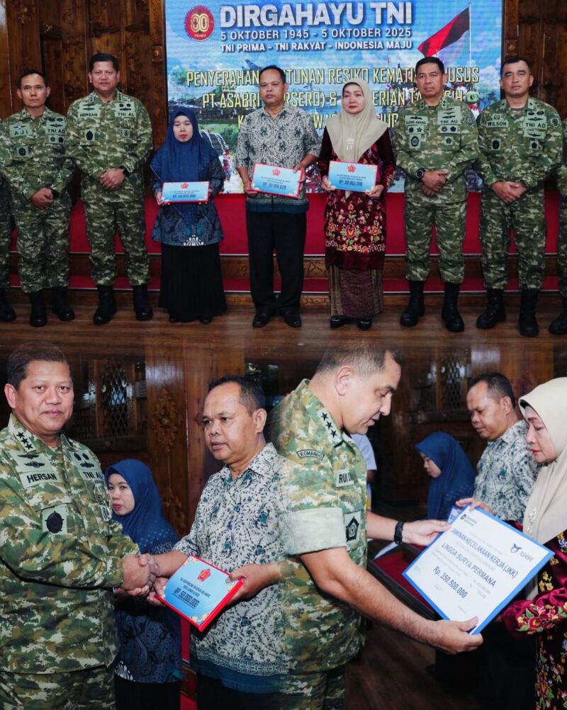 TargetLink.id – (Puspen TNI), Panglima TNI Jenderal Agus Subiyanto melalui Inspektur Jenderal TNI Laksdya Hersan dan Inspektur Jenderal Kementerian Pertahanan Letjen Rui Duarte menyerahkan santunan risiko kematian dari PT ASABRI kepada keluarga prajurit TNI yang gugur. Acara ini berlangsung di Mabes TNI Cilangkap, Jakarta Timur, Kamis (9/10/2025), bertepatan dengan rangkaian HUT ke-80 TNI.